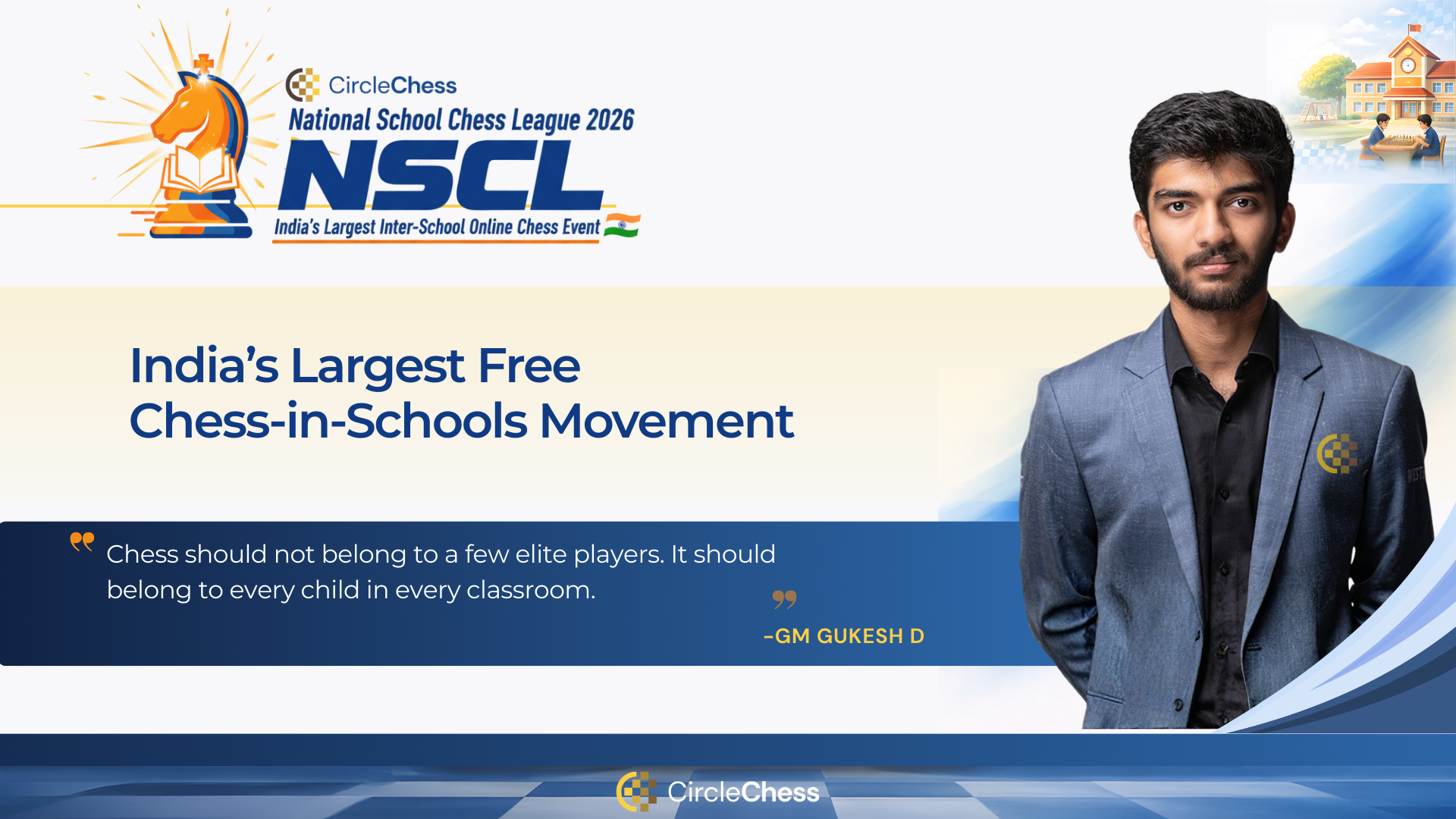 India is set to witness one of the most ambitious school-level chess movements in its history. The National School Chess League (NSCL) 2026 has officially opened onboarding for schools nationwide with a clear objective: to make structured chess education accessible to every student — at zero cost to schools.Powered by Gukesh Dommaraju, structured by renowned coach Vishnu Prasanna and IM Soumya Swaminathan, and presented by CircleChess, NSCL aims to build India’s most competitive and inclusive inter-school chess ecosystem.